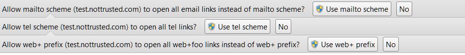 It's also interesting to note how the registered protocol handlers would be stored. Chrome was the only browser that registered handlers at the OS-layer, making them available to all applications. In Windows this meant storing the registrations in the registry under the HKEY_CLASSES_ROOT hive, which required administrative elevation to register. In Ubuntu, they'd be stored in ~/.local/share/applications/mimeapps.list. Opera stored registered protocol handlers in C:\Users\chris\AppData\Roaming\Opera\Opera\handlers.ini where they were only available to Opera, and Firefox took the same approach, storing them in C:\Users\chris\AppData\Roaming\Mozilla\Firefox\Profiles\wj7x1dmj.default\mimeTypes.rdf where they were actually mapped using the URN protocol.