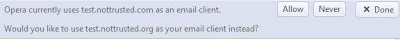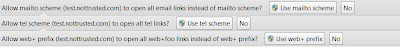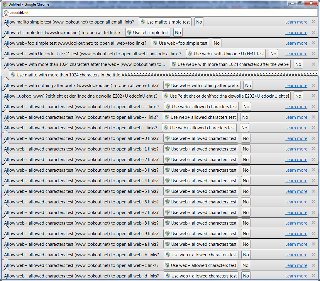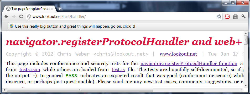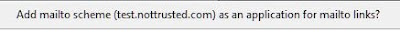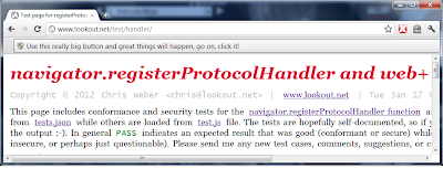 As far as penetration testing Web applications, we'll want to keep an eye out for usage of navigator.registerProtocolHandler, and closely inspect what the use case and implementation details might be. For example, it makes sense that GMail or Hotmail would want to register the mailto handler to their URL. Is that URL dynamically generated and can it be controlled by user-input? If an attacker could for example inject the hostname part of the URL then they could cause some mischief, or at the least steal email addresses and other data present in the mailto link. We'll also want to keep an eye out for registrations of web+foo schemes for similar issues including data ex-filtration and URL-control. I'm sure other folks can think of more threats and abuse cases, if so please let me know! Otherwise, time will tell.