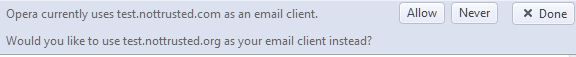Also fortunate, all of the browsers tested properly prohibited cross-origin registrations, even within the same general domain - registrations to a subdomain and parent domain were both prohibited, as were registrations to completely different domains. However, both Firefox and Opera allowed registrations to https from an http domain, but only Firefox allowed the reverse - registration from an https origin to http. Additionally, Firefox was the only browser to allow registrations to URIs with completely arbitrary ports, e.g. 23.